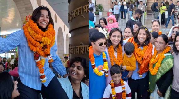 दून एयरपोर्ट पर स्नेह राणा का ढोल नगाड़ों से स्वागत