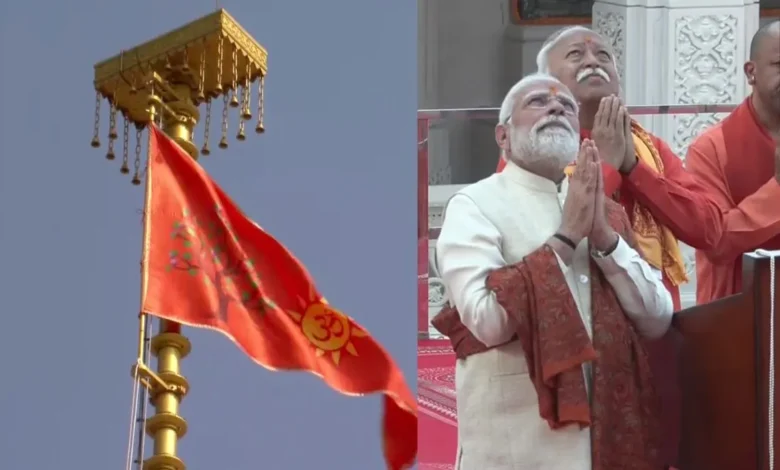 प्रधानमंत्री मोदी और आरएसएस सरसंघचालक मोहन भागवत ने पवित्र श्री राम जन्मभूमि मंदिर के शिखर पर भगवा ध्वज फहराया, जो मंदिर निर्माण के पूरा होने का प्रतीक है। 10 फीट ऊंचा और 20 फीट लंबा समकोण त्रिभुजाकार ध्वज, भगवान श्री राम के तेज और पराक्रम का प्रतीक है।