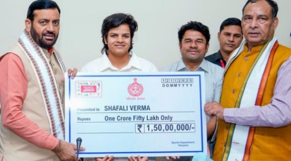हरियाणा सरकार की तरफ से 1.50 करोड़ का कैश अवार्ड और ग्रेड ए ग्रेडेशन सर्टिफिकेट दिया गया। हरियाणा महिला आयोग ने भी शेफाली को अपना ब्रांड एंबेसडर नियुक्त किया। सीएम ने कहा कि शेफाली ने ना केवल प्रदेश बल्कि पूरे देश का मान बढ़ाया। शेफाली पूरे देश के युवाओं के लिए प्रेरणास्रोत है। शेफाली वर्मा ने परिवार सहित हरियाणा सरकार का धन्यवाद किया है। उन्होंने कहा कि पूरे देश में हरियाणा खेलों का रोल मॉडल है। उन्होंने खिलाड़ियों को प्रोत्साहित करने के लिए हरियाणा सरकार का धन्यवाद किया।